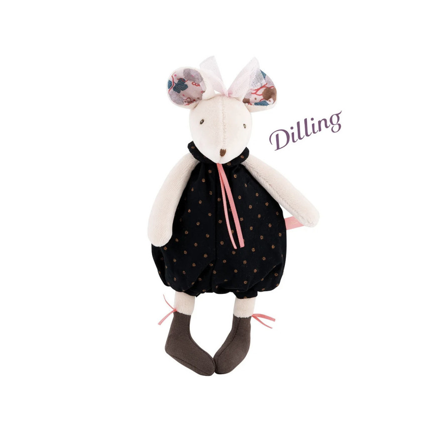 Sød og blød musse-rangle / babylegetøj fra franske Moulin Roty. Musen Mousse i en fin lille dragt og musens arme og ben er perfekte for det lille barn at gribe fat i.