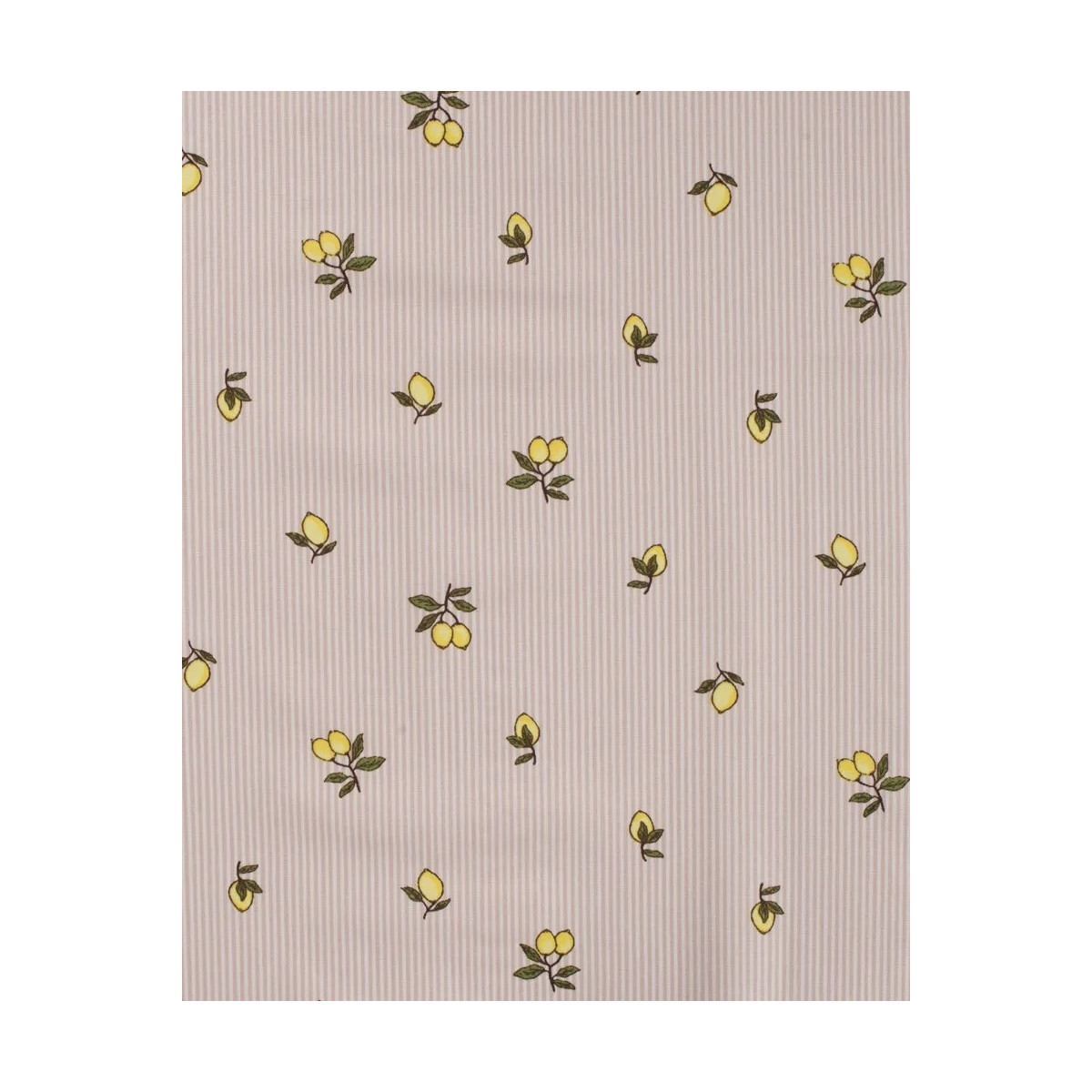Printet bomuldspoplin med citroner på stribet hvid og lyserød baggrund.