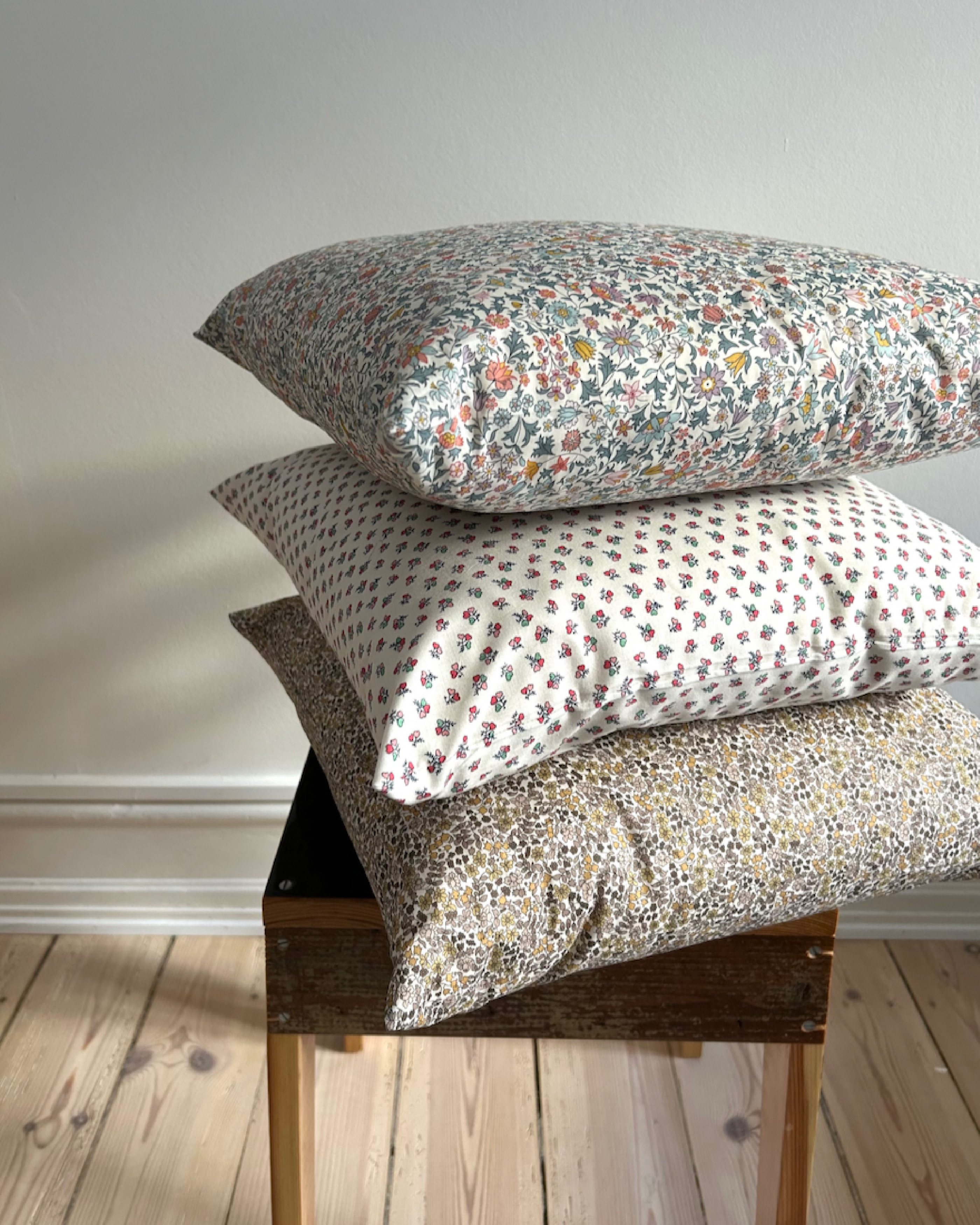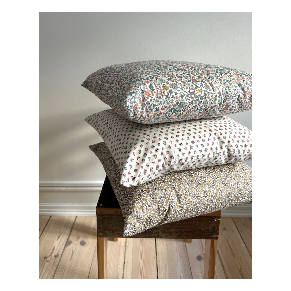 Pudebetræk laves i Liberty Fabrics med lynlås i bunden. Lækker oeko-tex certificeret pude med Fossflake fyld, der minder om dun, bevarer form og fylde og ike klumper sammen.