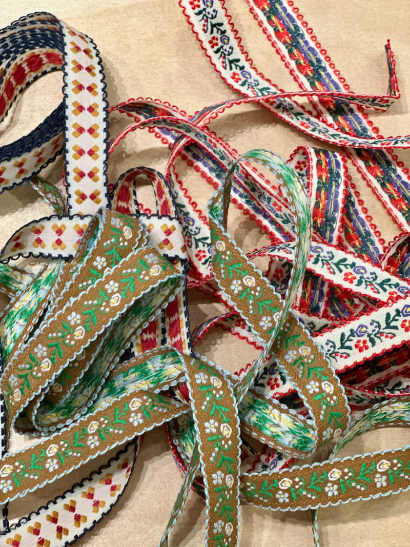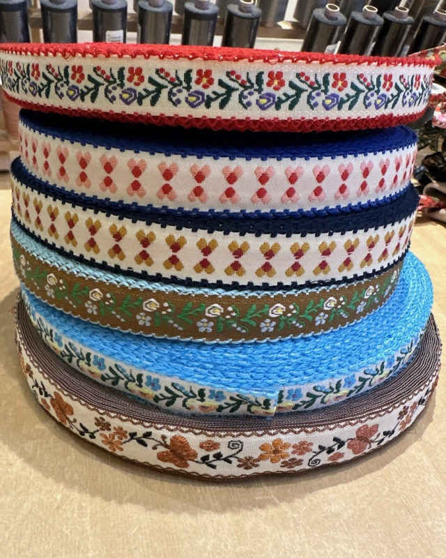 Broderet bånd blomster og blå tungekant.