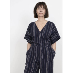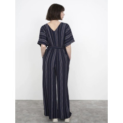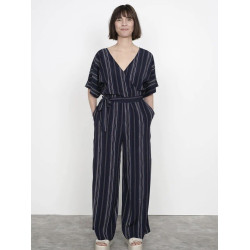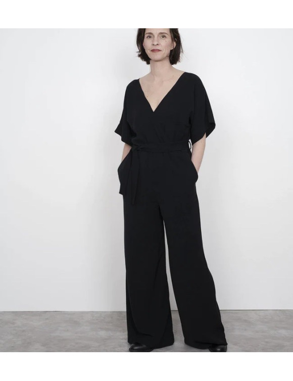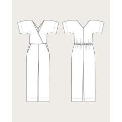 Denne buksedragt med brede ben er nem at gå til. Buksedragten har V-udskæring for og bag, lommer, brede ben og elastik i taljen bag.