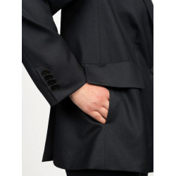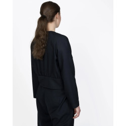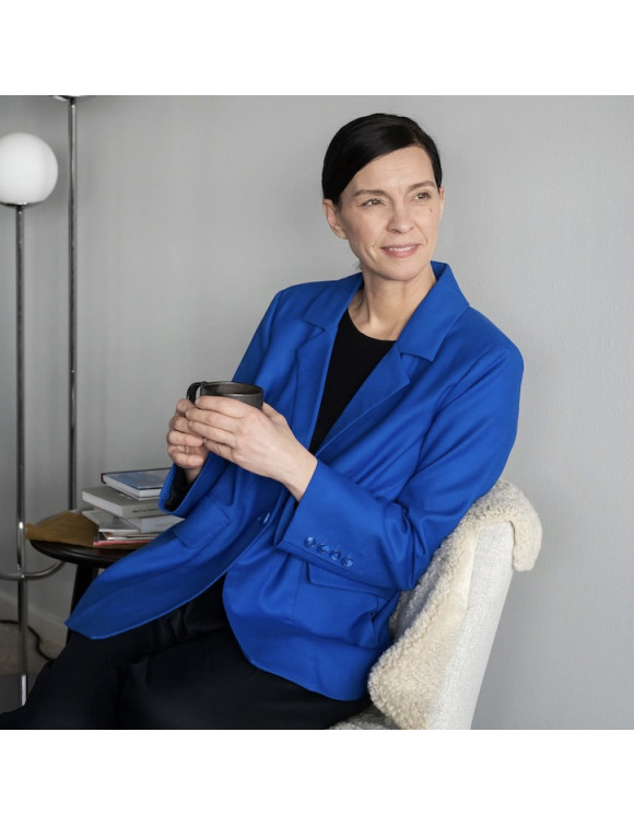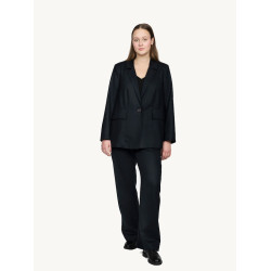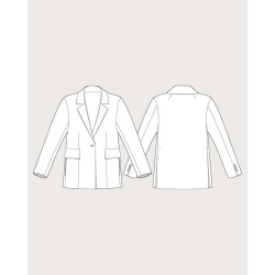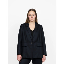 Blazeren er en smule oversized. Lommeklap med fake-lomme – lommeindgangen er i stedet skjult i sømmen foran ved siden. Jakken har en enkelt-knaps-lukning, slidser bagpå og på ærmet.