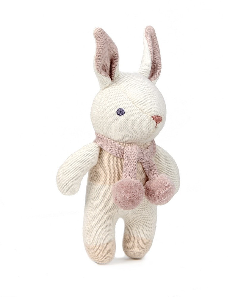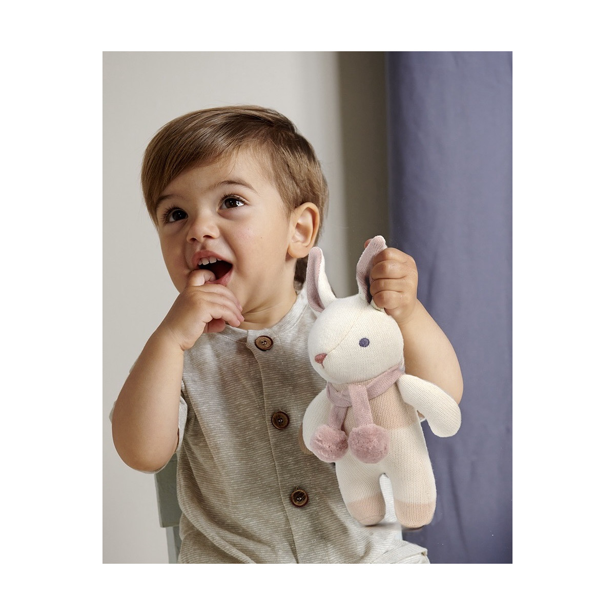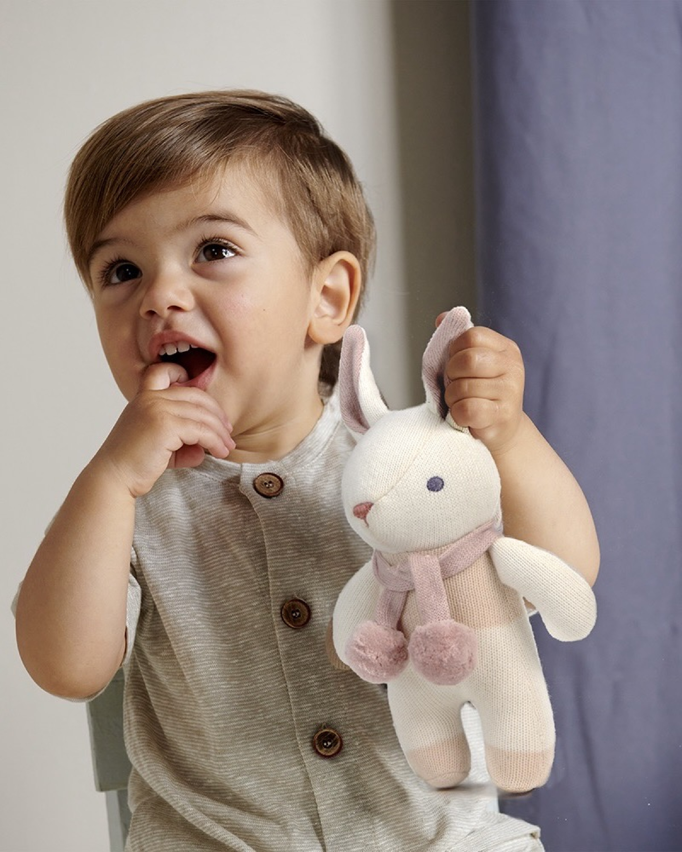 Charming mouse soft toy rattle, a sorcerer's apprentice to grant baby's wishes, with powder-pink cheeks, with a charming tulle bow on her head and dressed in bloomers with a Peter Pan collar in black cotton voile with gold-coloured polka dots.