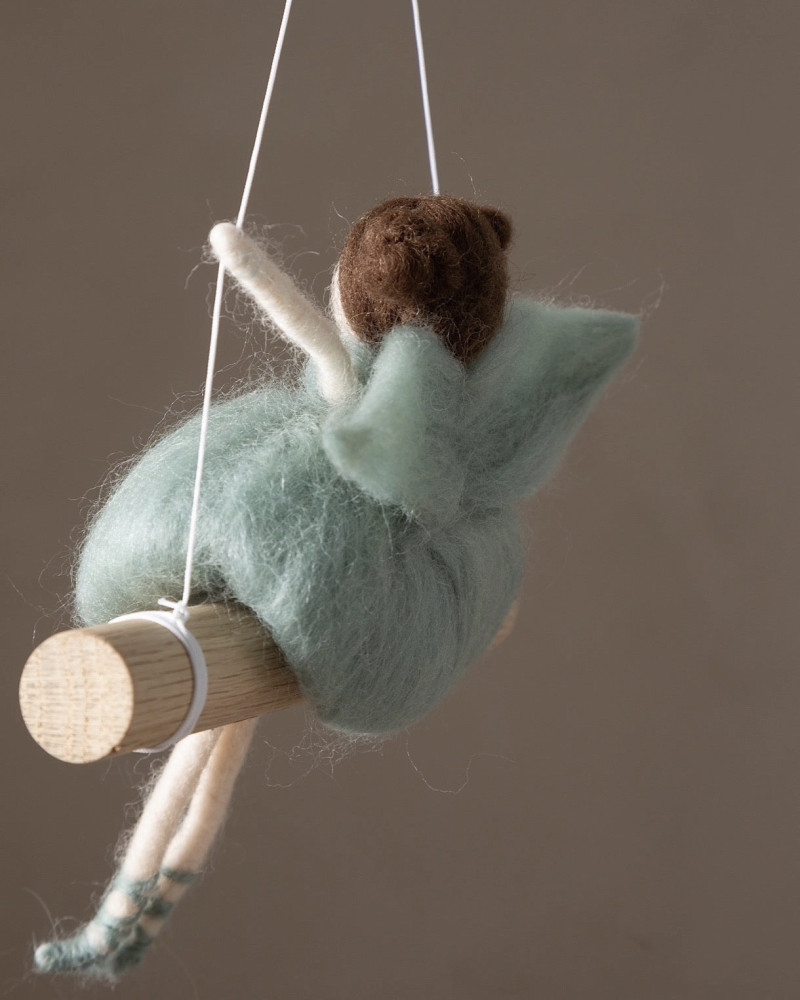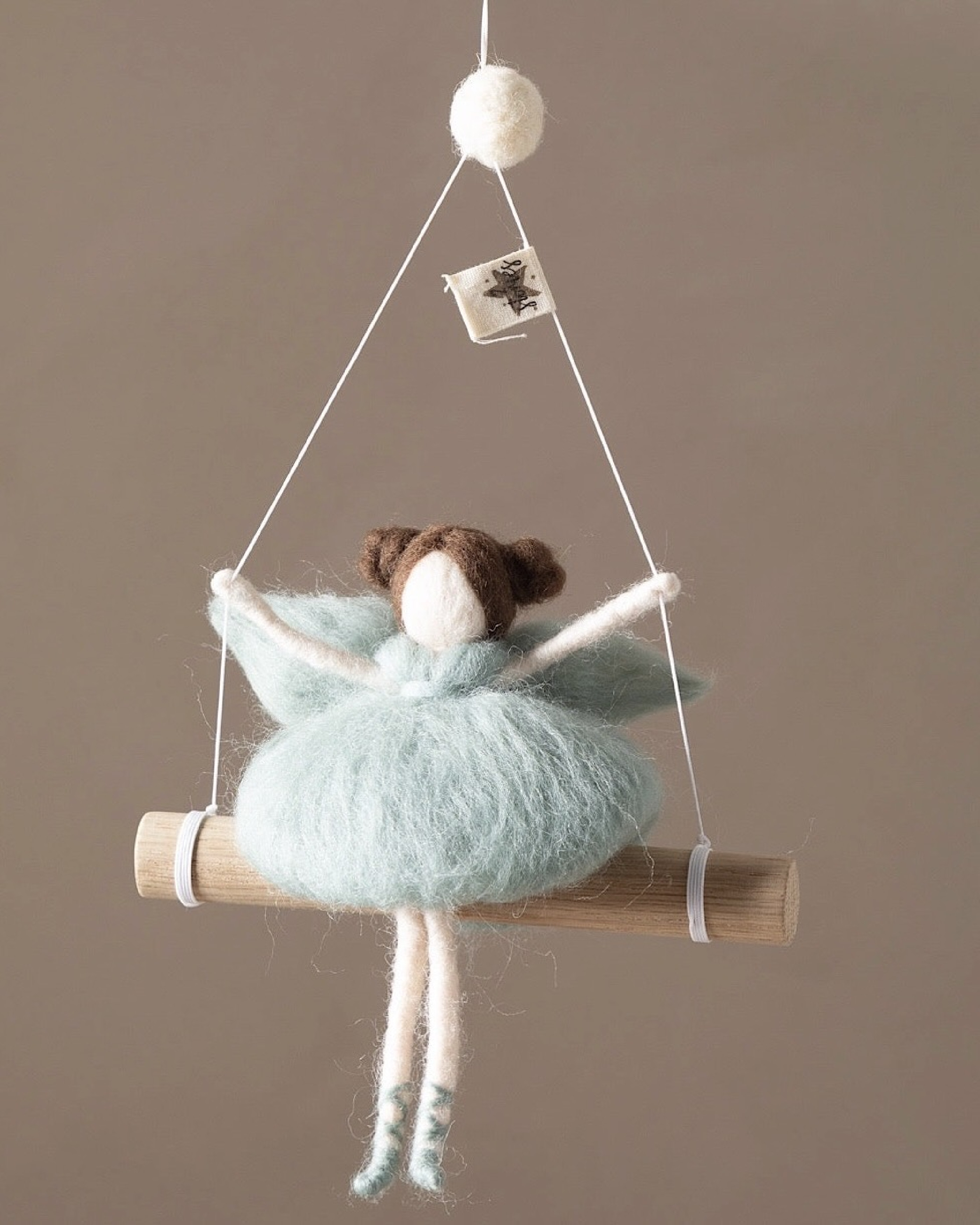 This adorable baby mobile features a felted figure lovingly handmade. The figure a light blue ballerina dress and sits on an elegant wooden swing.