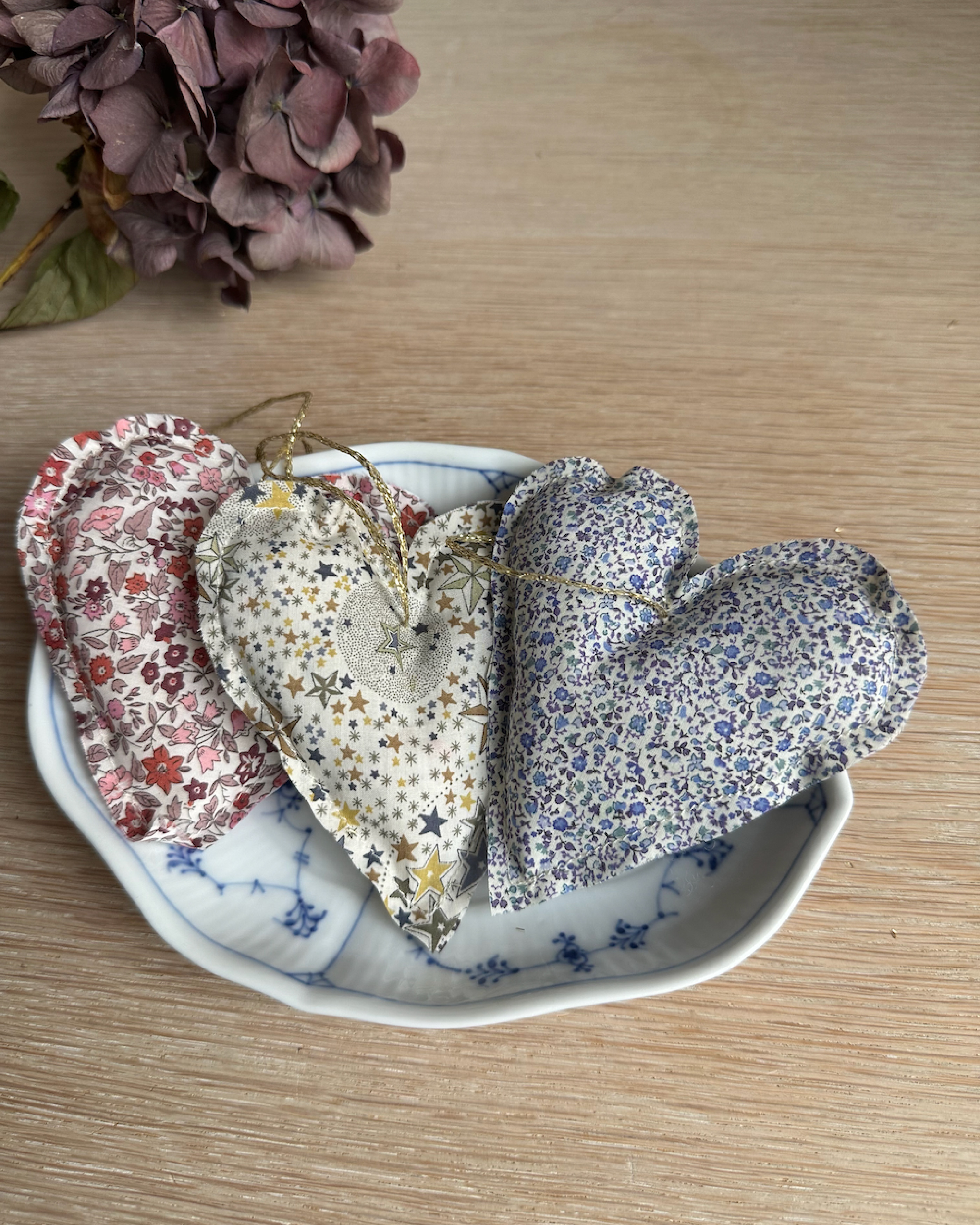 Her får du håndlavet julepynt - lille hjerte i Libertystof. Lige til at hænge op.