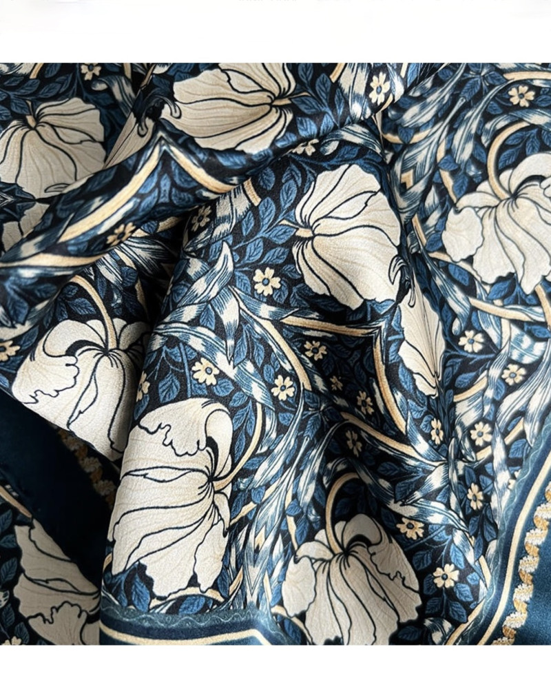 Add this luxurious silk scarf. The botanically inspired pattern in cool blue shades creates a timeless and eye-catching expression. The soft silk drapes beautifully and makes the scarf perfect for both everyday life and festive occasions.