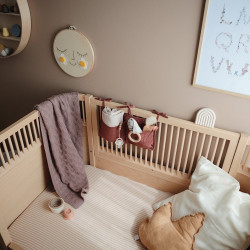 The decorative and multifunctional crib pocket, made from 100% cotton, is compatible with most cribs.