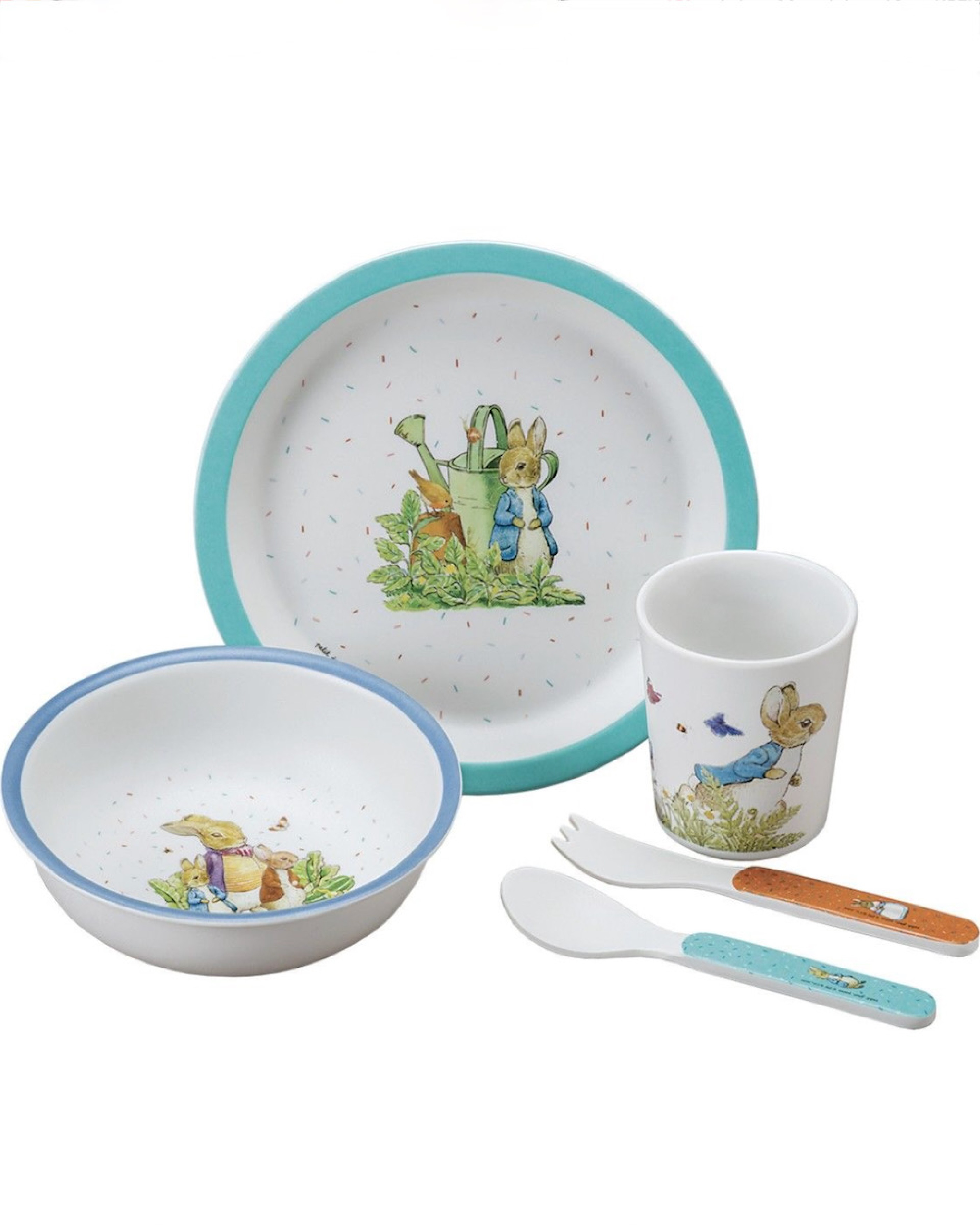 Nice gift box with Peter Rabbit childrens plates set in melamin. The gift box contains a fork and spoon, a bowl, a cup and a plate.