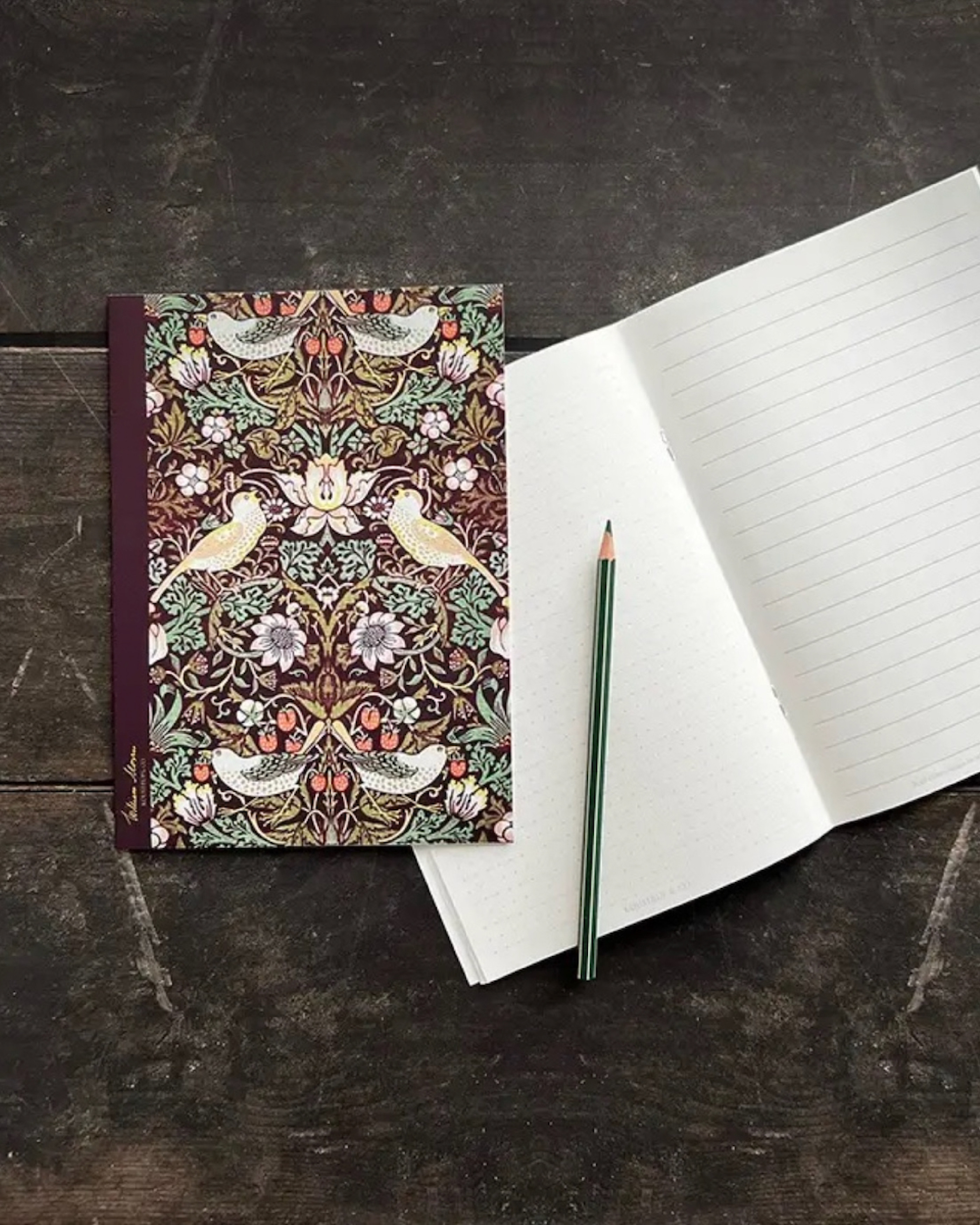 Beautiful notebook with an original William Morris design featuring a pattern of lovely birds and strawberries.